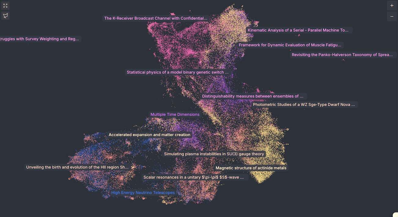 A semantic map of 100,000 papers from arXiv.org. Identify the major research areas and emerging topics.
